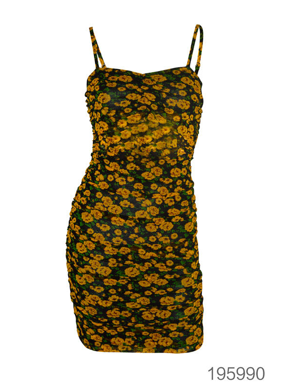 Yellow Ruched Floral Mini Dress